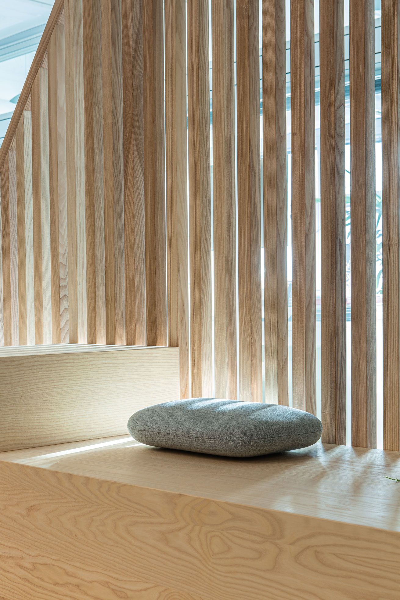 Die zentrale Pergola gliedert den Raum und vermittelt bereits beim Betreten Gelassenheit und Offenheit. Licht und Schatten formen eine angenehme Atmosphäre für Mitarbeitende und Gäste.